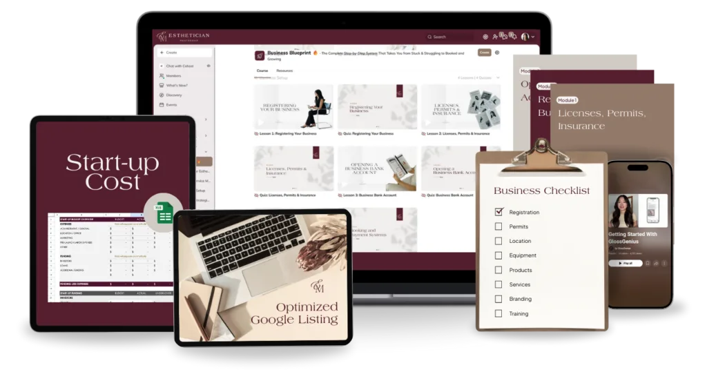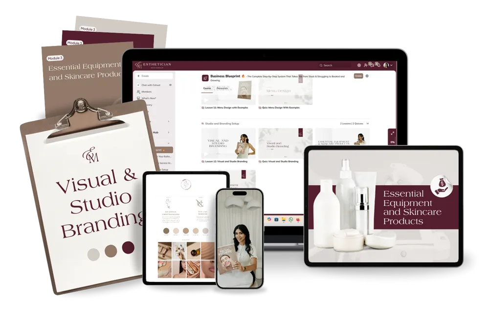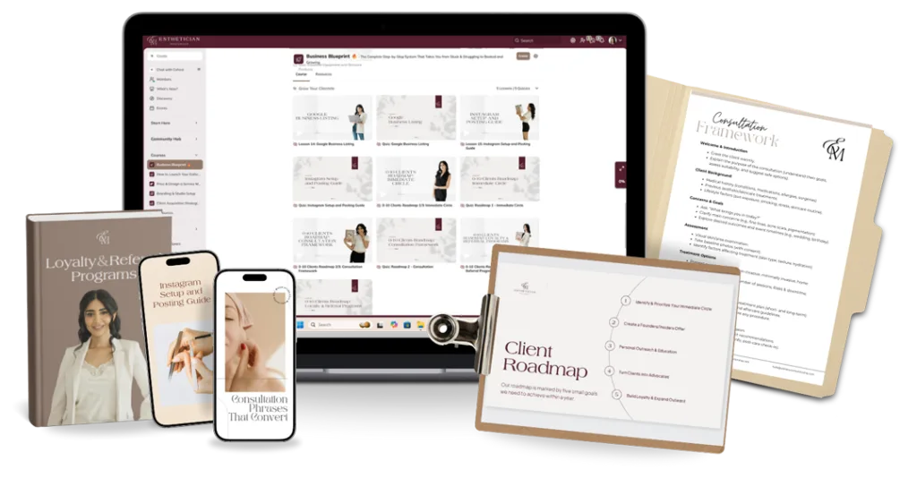 The Esthetician Business Blueprint isn’t another random course. It’s the comprehensive system specifically designed for new and solo estheticians who want to go from struggling with no clients to having 10 regular bookings and a growing practice.