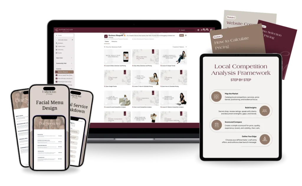Unlike generic business courses that ignore esthetics-specific needs, expensive business coaching that’s out of reach for solo estheticians, or scattered free content that leaves costly gaps, this teaches you the complete fundamentals at a fraction of the cost.